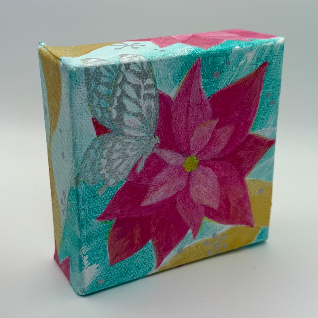 2025東京展示会メイン作品のパーティーアート「クリスマスパーティー」 04「ポインセチアと銀の蝶」 ゴールドのリボンと真っ赤なポインセチアに、シルバーの蝶が舞う、クリスマスの雰囲気の中にも久保木亜紀らしい作品。 10×10×3cm キャンバス アクリル絵の具