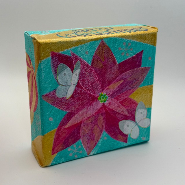 2025東京展示会メイン作品のパーティーアート「クリスマスパーティー」 32「ポインセチアとモンシロチョウ」 クリスマスらしいポインセチアとモンシロチョウを組み合わせた、久保木亜紀らしい作品。上部のリボンには、アンティークを思わせる古い英字書体で「Merry Christmas」の文字が描かれています。 10×10×3cm キャンバス アクリル絵の具