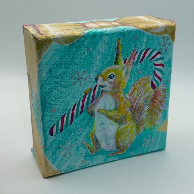 2025東京展示会メイン作品のパーティーアート「クリスマスパーティー」 08「クリスマスキャンディを運ぶエゾリスさん」 ふわふわのしっぽと長い耳が可愛いエゾリスさん。ゴールドのリボンで囲み、華やかなパーティーに向かう様子を描いてます。 10×10×3cm キャンバス アクリル絵の具
