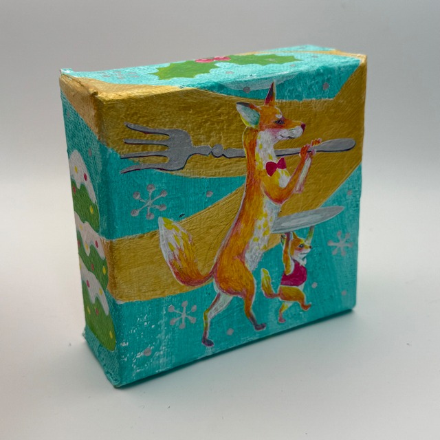 2025東京展示会メイン作品のパーティーアート「クリスマスパーティー」 33「ケーキをもらいに行くキツネの親子」 森の中をマイフォークと取り皿を持って、ケーキをもらいに行くキツネの親子。上部には柊、下部にはキャンディが描かれた、おとぎ話のような作品。 10×10×3cm キャンバス アクリル絵の具