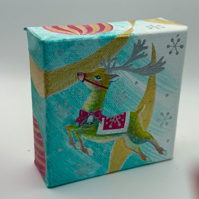 2025東京展示会メイン作品のパーティーアート「クリスマスパーティー」 06「鈴を鳴らして飛ぶトナカイさん」 空を舞うリボンとオーナメントの間を、鈴の音に合わせて飛ぶトナカイさん。 10×10×3cm キャンバス アクリル絵の具