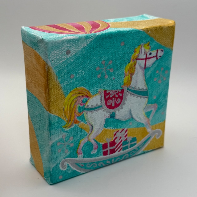 2025東京展示会メイン作品のパーティーアート「クリスマスパーティー」 16「プレゼントを運ぶロッキングホース」 おもちゃのお馬さんの足元にたくさんのプレゼントを描いた、温かい作品。 10×10×3cm キャンバス アクリル絵の具