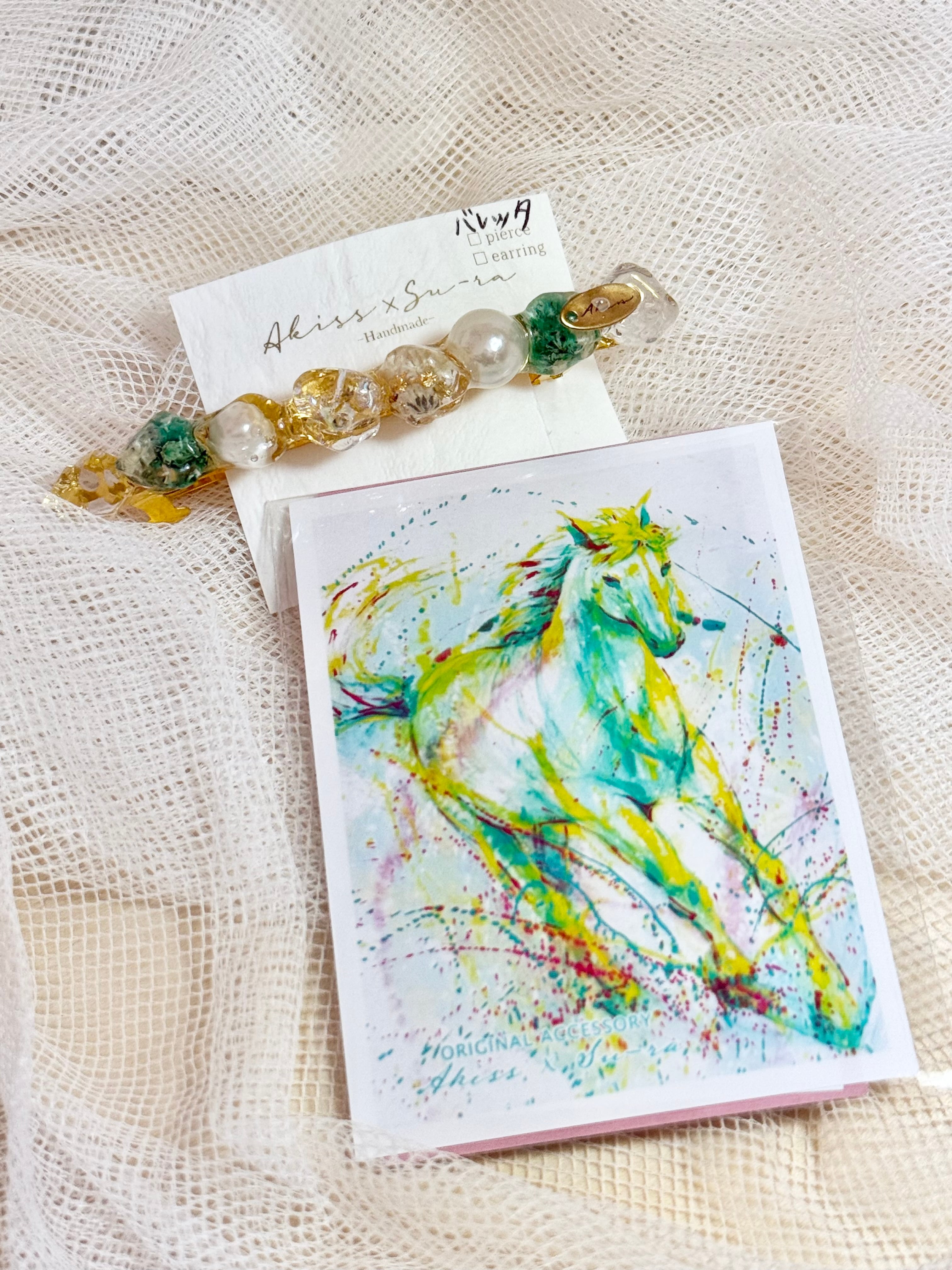 イラストレーター久保木亜紀とハンドメイド作家su-raのコラボアクセサリー。久保木亜紀の絵をイメージして作られたAkissオリジナルタグ付きの限定カラー商品!絵のカードとセットでお届け致します。