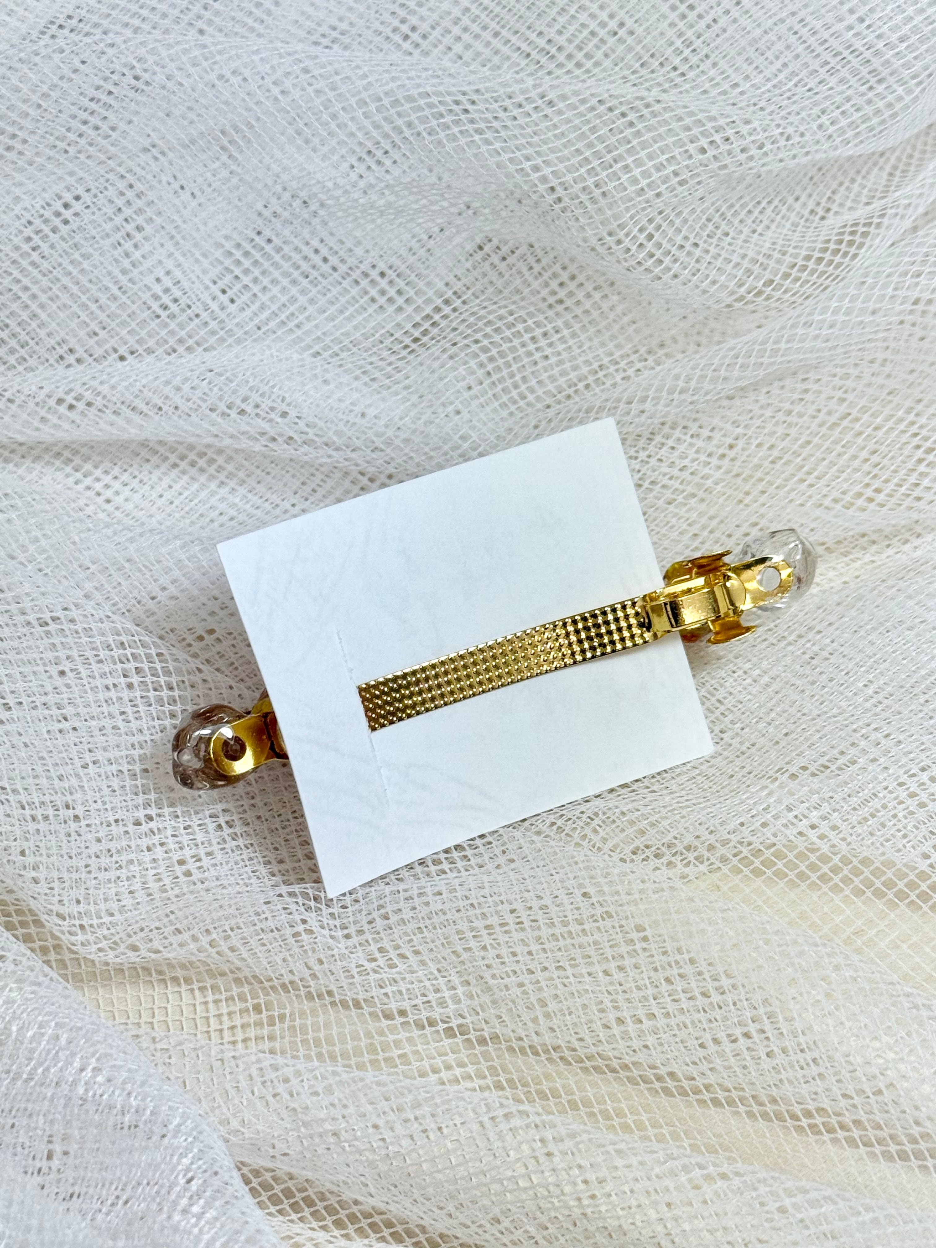 華やかなドライフラワーとゴールドで色付けされた、蛇の輝く鱗を思わせるバレッタ。上品なパールがポイント!同じシリーズのピアスとイヤリングもございます。