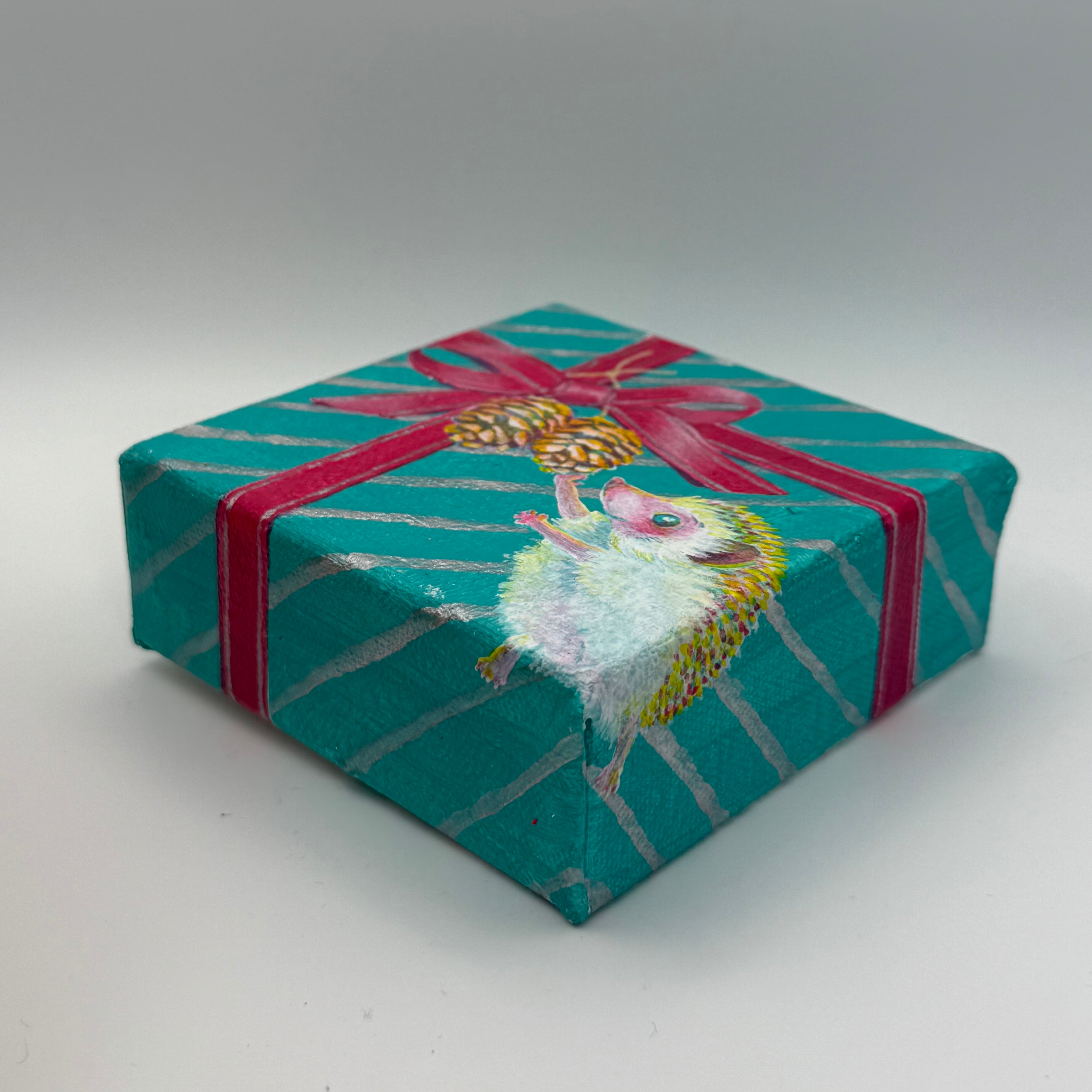 ハリネズミさんがプレゼントに松ぼっくりを添えている、インテリアのように置いて楽しむことをイメージして描かれた作品。