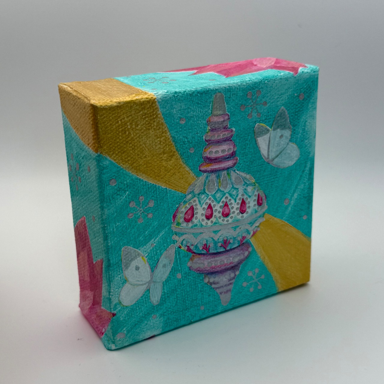 淡い優しい色合いのオーナメントにモンシロチョウが舞う、クリスマスと久保木亜紀の世界観がマッチした作品。これまでのシリーズに合わせたい方におすすめ。