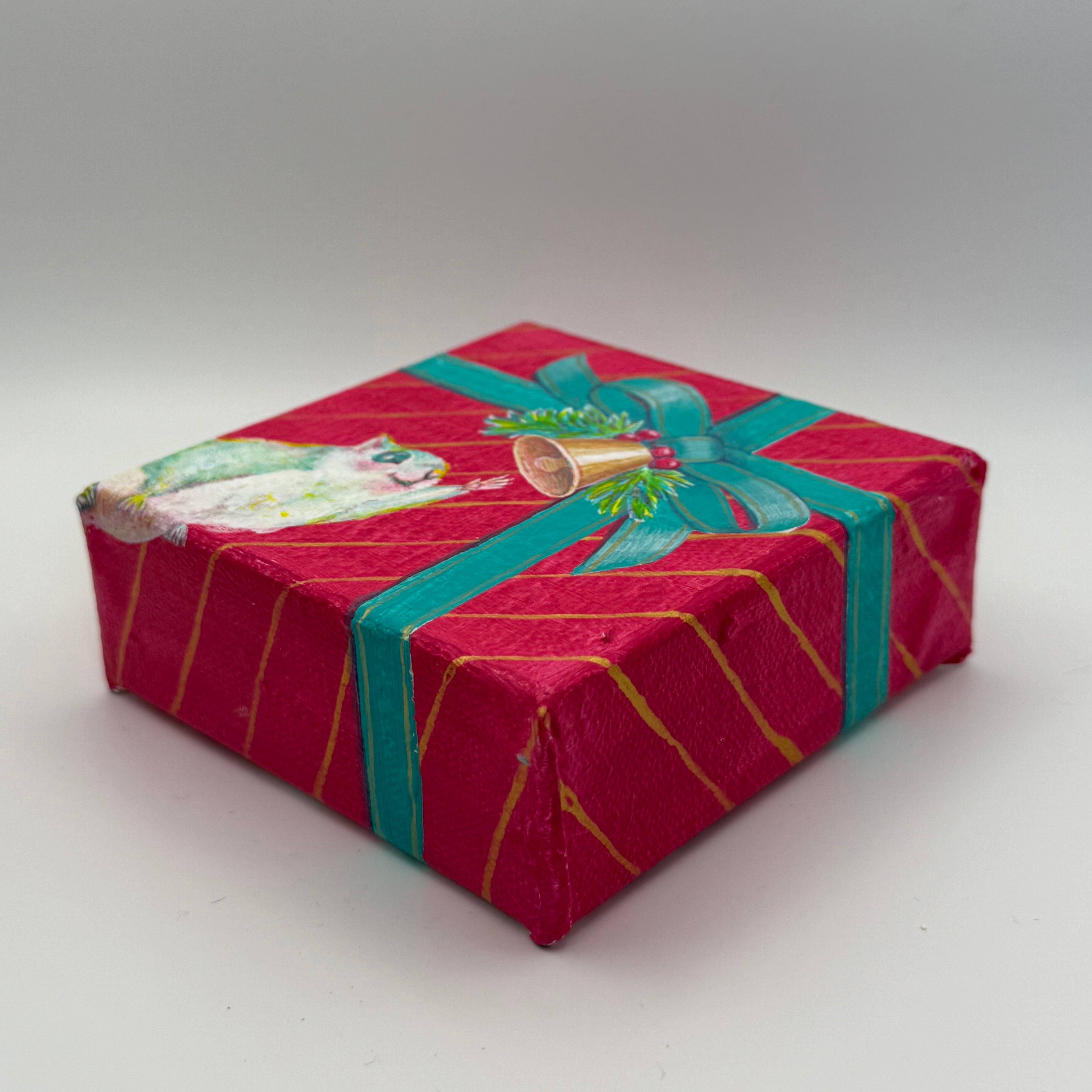 エゾモモンガがクリスマスプレゼントの飾り付けをしている、インテリアのように置いて楽しむことをイメージして描かれた作品。