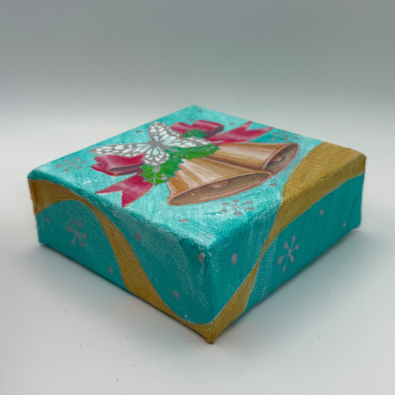 クリスマスベルと蝶を組み合わせた久保木亜紀らしい作品。上部のリボンには、アンティークを思わせる古い英字書体で「Merry Christmas」と描かれています。