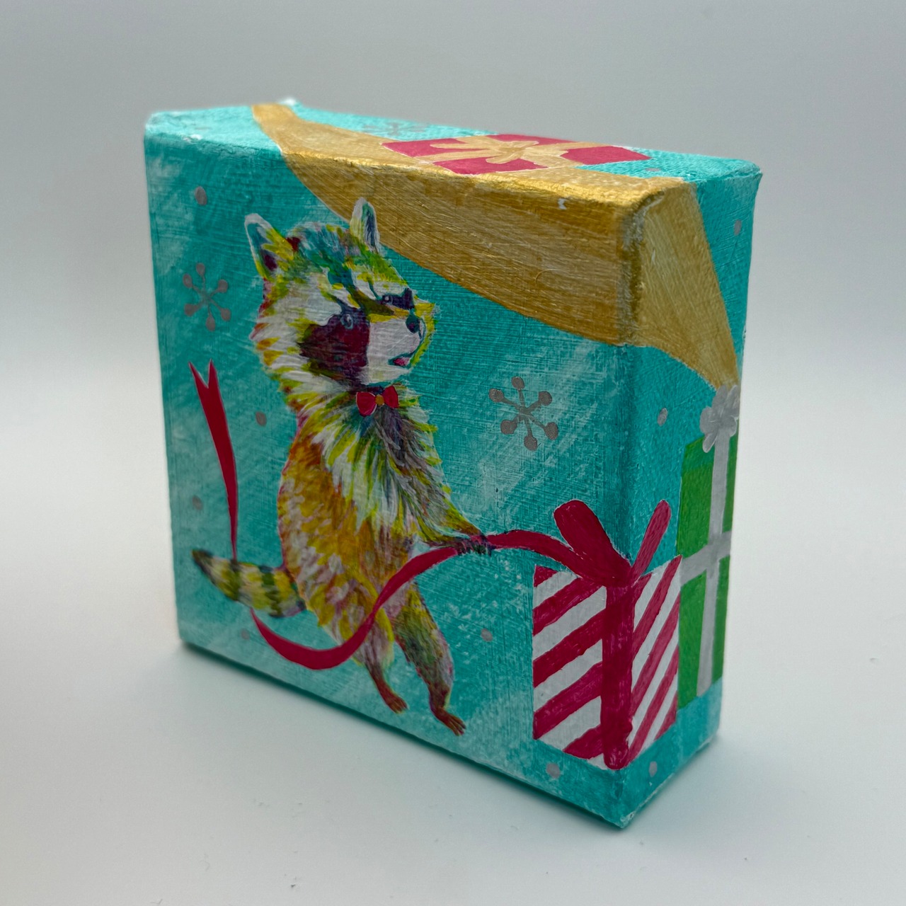 パーティーアート全体の中では、レッサーパンダくんとプレゼントを取り合っているように見えていたアライグマくん。沢山のプレゼントを一生懸命開けています。