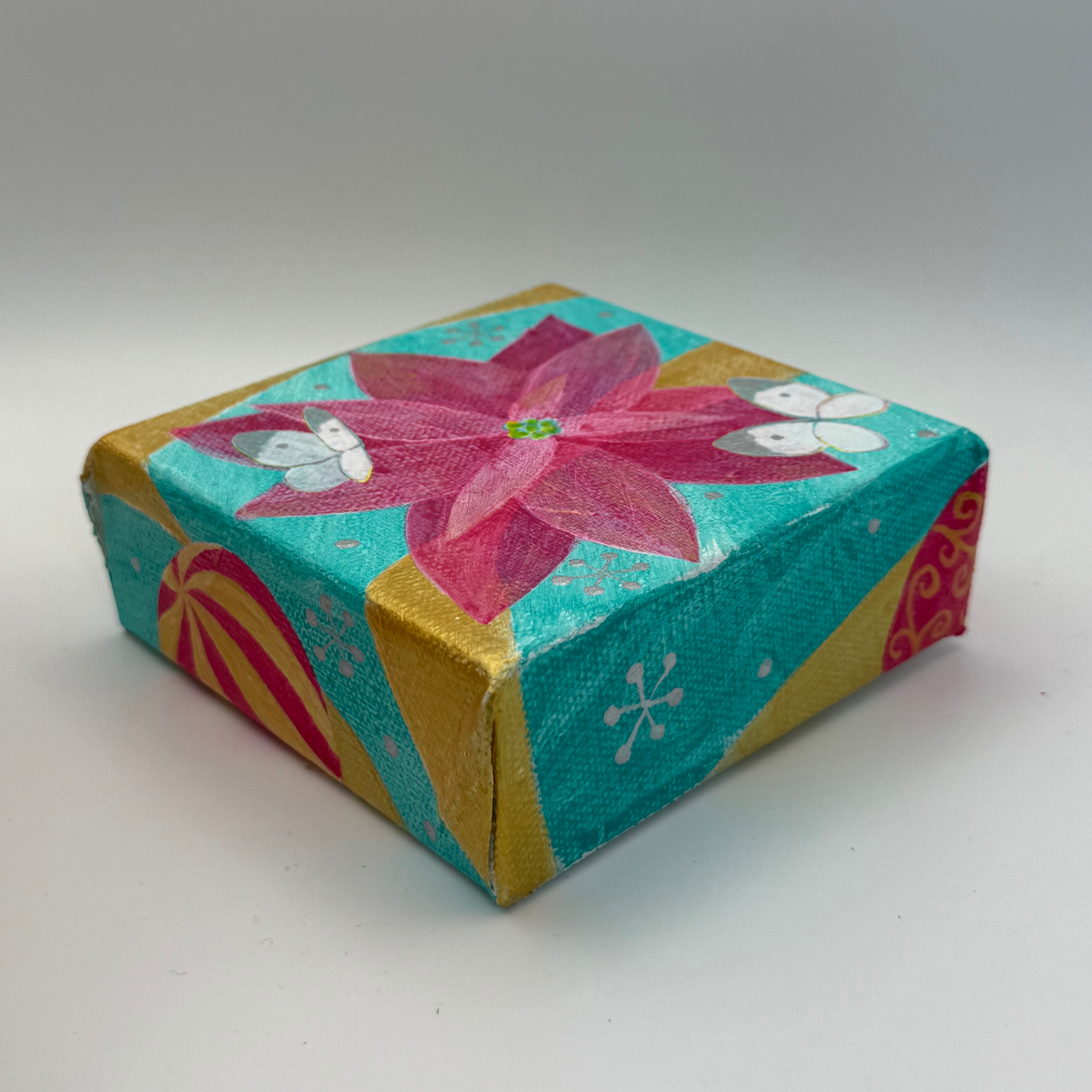 クリスマスらしいポインセチアとモンシロチョウを組み合わせた、久保木亜紀らしい作品。上部のリボンには、アンティークを思わせる古い英字書体で「Merry Christmas」の文字が描かれています。